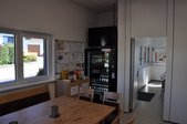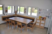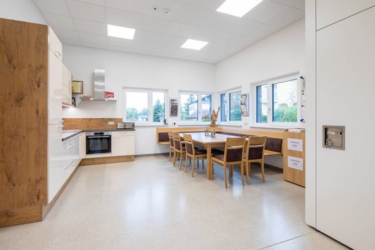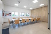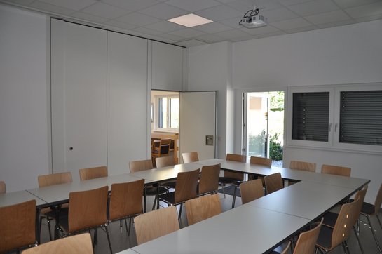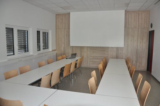 Der Schulungsraum ist mit Beamer, Leinwand und Laptop ausgestattet und bietet für 24 Personen Platz. Bei Bedarf kann für größere Veranstaltungen eine mobile Trennwand zwischen Schulungs- und Mannschaftsraum geöffnet und so weiterer Platz geschaffen werden, zusätzlich können Präsentationen dann auch am Fernseher im Mannschaftsraum wiedergegeben werden. Im vorderen Bereich des Schulungsraumes wurde durch raumhohe Kästen Stauraum für Bekleidung und sonstige Ausrüstung geschaffen.