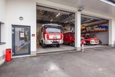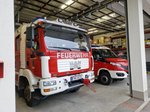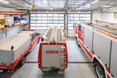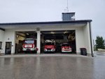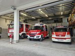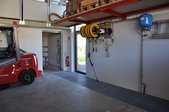 In der Fahrzeughalle finden die drei Einsatzfahrzeuge unserer Wehr Platz. Zusätzlich sind im vorderen Hallenbereich ein WAS-Einsatzinformationsdrucker, ein Einsatzmittelregal für häufig benötigte Geräte und Verbrauchsmaterial, eine Schmutzschleuse zur Stiefel- und Handwäsche und der Stiegenaufgang ins Lager platziert. Im hinteren Hallenbereich ist das Tor zum Schlauchturm und davor eine Rinne zur Schlauchwäsche, sowie der Hochdruckreiniger mit Haspel, eine Wasser- und eine Druckluftschlauchhaspel untergebracht. Darüber befindet sich noch ein Regal für insgesamt 16 Palettenstellplätze. Hinter dem Stellplätzen für KLFA und LAST ist der Stapler abgestellt und der Zugang zur Werkstätte.