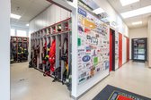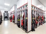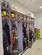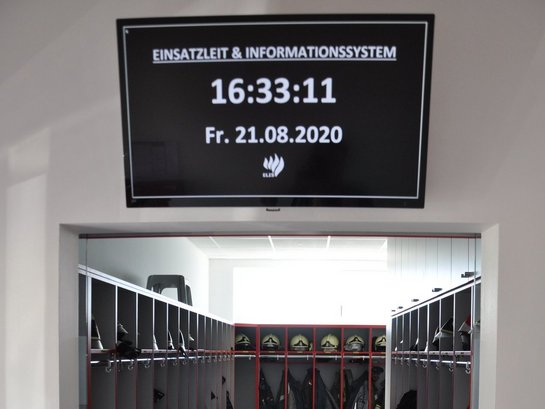 Der Herrenspindraum verfügt über insgesamt 73 Spinde, wobei die 12 Höhenretter jeweils einen Doppelspind besitzen. Über der Tür zur Fahrzeughalle befindet sich ein zusätzlicher Monitor mit den aktuellen Einsatzinformationen.