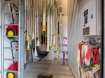 Oberhalb der Werkstatt befindet sich das Lager für diverse Gerätschaften der Feuerwehr. Schwere Geräte und Ausrüstungsgegenstände können über aushängbare Paneele im Geländer mit dem Stapler hinuntergehoben werden. Daneben befindet sich der Haustechnikraum mit Heizung, Elektro- und Haustechnikschaltschrank und Druckluftkompressor.