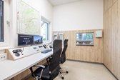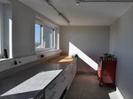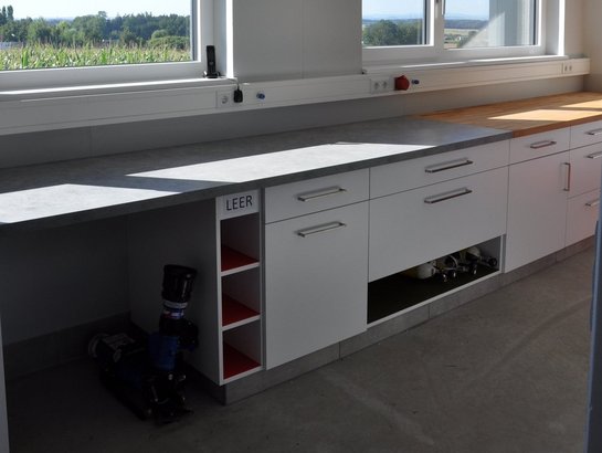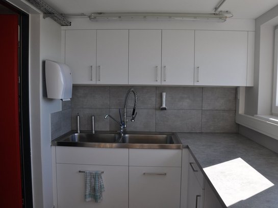 Die Werkstätte im hinteren Bereich der Fahrzeughalle kombiniert die Atemschutz- und normale Werkstätte in einem Raum. Dazu ist der Raum mit einem großen Doppelwaschbecken und einer Arbeitsfläche zur Reinigung und Wartung der Atemschutzgeräte und -masken ausgestattet. Im hinteren Bereich ist eine Holzarbeitsplatte mit Schraubstock und ein Werkzeugwagen für kleinere Reparaturen untergebracht.